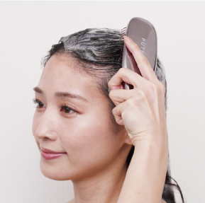 シャンプーを泡立てた後、ブラシを軽く頭皮に当てて、髪の生え際から頭頂部に向かって小刻みにブラッシングしてください。
