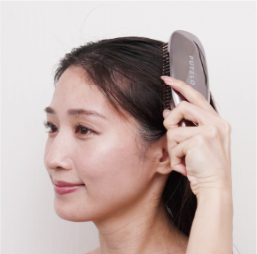 頭皮にパックを塗布後、シャンプー時同様にブラッシングした後、ブラシを使用して髪全体に馴染ませます。