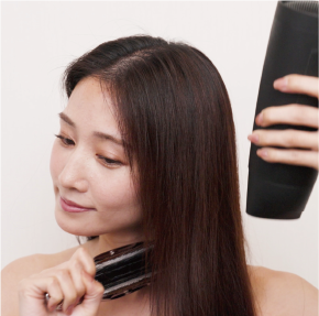 ドライヤーから20cm離して、ブラッシングしながらドライしてください。 ボリュームを出したい所は根本から立ち上がるようにブラッシングします。