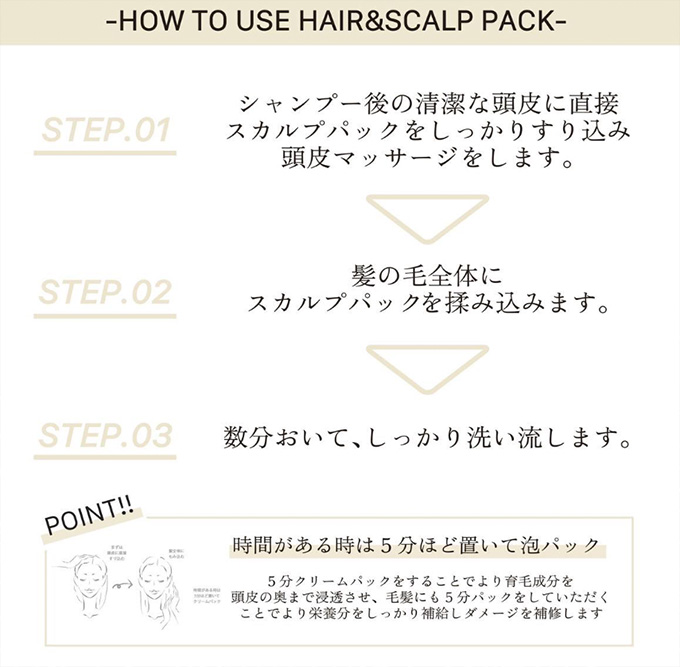 5分クリームパックをすることでより育毛成分を頭皮の奥まで浸透させ、毛髪にも5分パックをしていただくことでより栄養分をしっかり補給しダメージを補修します✨