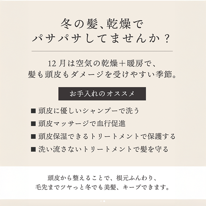 12月は空気の乾燥+暖房で、髪も頭皮もダメージを受けやすい季節。